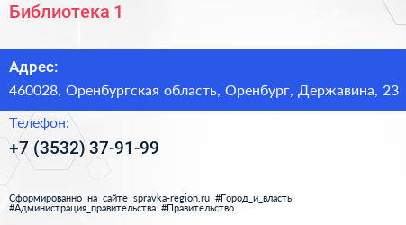 Библиотека №1 по адресу 460028, Оренбургская область, Оренбург, Державина, 23 в дальнейшем Организация, размещена в следующих категориях: