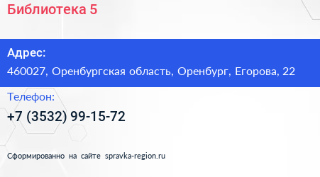 Библиотека №5 по адресу 460027, Оренбургская область, Оренбург, Егорова, 22 в дальнейшем Организация, размещена в следующих категориях: