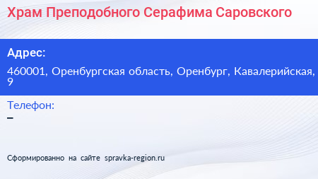 Храм Преподобного Серафима Саровского по адресу 460001, Оренбургская область, Оренбург, Кавалерийская, 9 в дальнейшем Организация, размещена в следующих категориях: