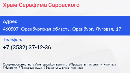 Храм Серафима Саровского по адресу 460507, Оренбургская область, Оренбург, Луговая, 17 в дальнейшем Организация, размещена в следующих категориях: