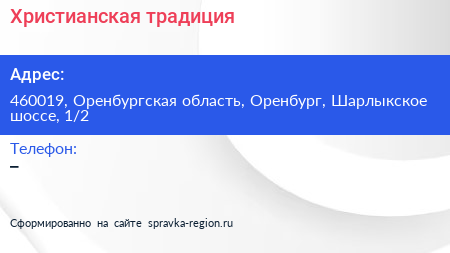 Христианская традиция по адресу 460019, Оренбургская область, Оренбург, Шарлыкское шоссе, 1/2 в дальнейшем Организация, размещена в следующих категориях: