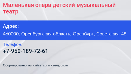 Маленькая опера, детский музыкальный театр по адресу 460000, Оренбургская область, Оренбург, Советская, 48 в дальнейшем Организация, размещена в следующих категориях: