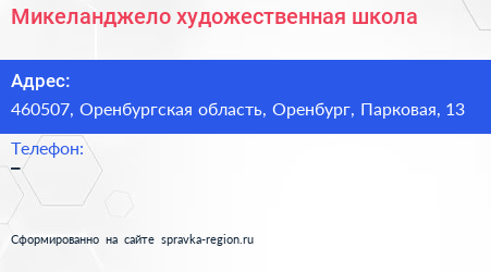 Микеланджело, художественная школа по адресу 460507, Оренбургская область, Оренбург, Парковая, 13 в дальнейшем Организация, размещена в следующих категориях: