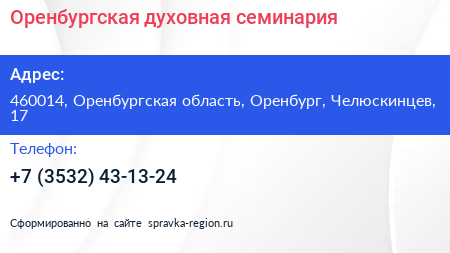 Оренбургская духовная семинария по адресу 460014, Оренбургская область, Оренбург, Челюскинцев, 17 в дальнейшем Организация, размещена в следующих категориях: