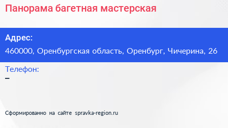 Панорама, багетная мастерская по адресу 460000, Оренбургская область, Оренбург, Чичерина, 26 в дальнейшем Организация, размещена в следующих категориях: