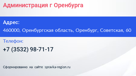 Администрация г. Оренбурга по адресу 460000, Оренбургская область, Оренбург, Советская, 60 в дальнейшем Организация, размещена в следующих категориях: