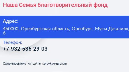 Наша Семья!, благотворительный фонд по адресу 460000, Оренбургская область, Оренбург, Мусы Джалиля, 6 в дальнейшем Организация, размещена в следующих категориях: