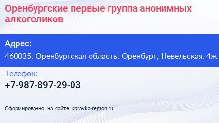 Оренбургские первые, группа анонимных алкоголиков по адресу 460035, Оренбургская область, Оренбург, Невельская, 4ж в дальнейшем Организация, размещена в следующих категориях: