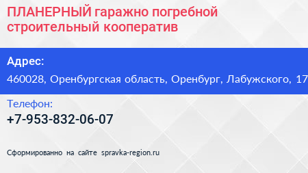 ПЛАНЕРНЫЙ, гаражно-погребной строительный кооператив по адресу 460028, Оренбургская область, Оренбург, Лабужского, 17 в дальнейшем Организация, размещена в следующих категориях: