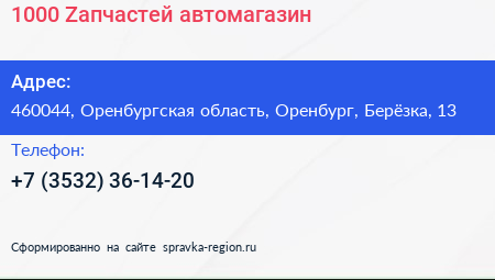 1000-Zапчастей, автомагазин по адресу 460044, Оренбургская область, Оренбург, Берёзка, 13 в дальнейшем Организация, размещена в следующих категориях: