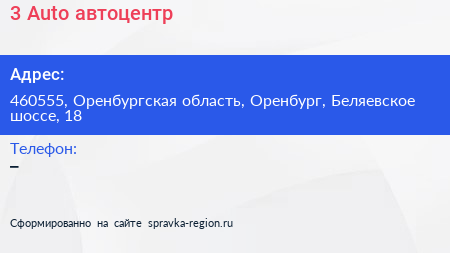3 Auto, автоцентр по адресу 460555, Оренбургская область, Оренбург, Беляевское шоссе, 18 в дальнейшем Организация, размещена в следующих категориях: