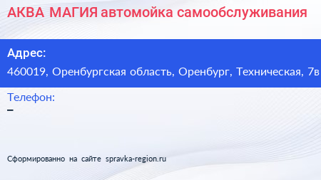 АКВА МАГИЯ, автомойка самообслуживания по адресу 460019, Оренбургская область, Оренбург, Техническая, 7в в дальнейшем Организация, размещена в следующих категориях: