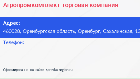 Агропромкомплект, торговая компания по адресу 460028, Оренбургская область, Оренбург, Сахалинская, 13 в дальнейшем Организация, размещена в следующих категориях: