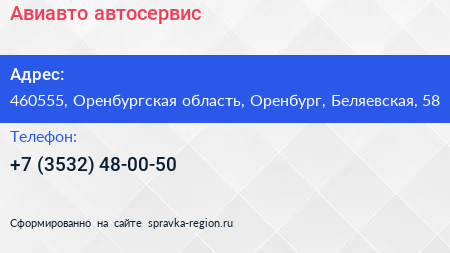 Авиавто, автосервис по адресу 460555, Оренбургская область, Оренбург, Беляевская, 58 в дальнейшем Организация, размещена в следующих категориях: