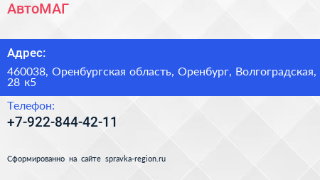АвтоМАГ по адресу 460038, Оренбургская область, Оренбург, Волгоградская, 28 к5 в дальнейшем Организация, размещена в следующих категориях: