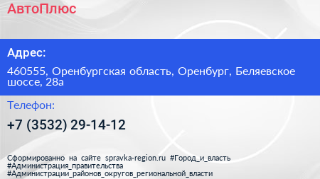 АвтоПлюс по адресу 460555, Оренбургская область, Оренбург, Беляевское шоссе, 28а в дальнейшем Организация, размещена в следующих категориях: