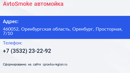 AvtoSmoke, автомойка по адресу 460052, Оренбургская область, Оренбург, Просторная, 7/10 в дальнейшем Организация, размещена в следующих категориях: