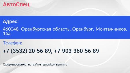 АвтоСпец по адресу 460048, Оренбургская область, Оренбург, Монтажников, 16а в дальнейшем Организация, размещена в следующих категориях: