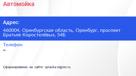 Автомойка по адресу 460004, Оренбургская область, Оренбург, проспект Братьев Коростелёвых, 54Б в дальнейшем Организация, размещена в следующих категориях: