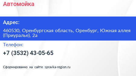 Автомойка по адресу 460530, Оренбургская область, Оренбург, Южная аллея (Приуралье), 2а в дальнейшем Организация, размещена в следующих категориях: