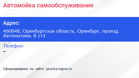 Автомойка самообслуживания по адресу 460048, Оренбургская область, Оренбург, проезд Автоматики, 8 ст1 в дальнейшем Организация, размещена в следующих категориях: