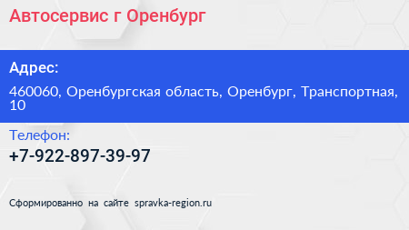 Автосервис, г. Оренбург по адресу 460060, Оренбургская область, Оренбург, Транспортная, 10 в дальнейшем Организация, размещена в следующих категориях: