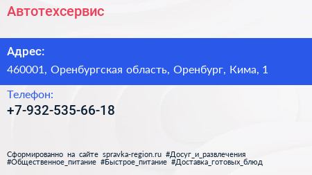 Автотехсервис по адресу 460001, Оренбургская область, Оренбург, Кима, 1 в дальнейшем Организация, размещена в следующих категориях:
