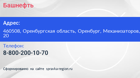 Башнефть по адресу 460508, Оренбургская область, Оренбург, Механизаторов, 20 в дальнейшем Организация, размещена в следующих категориях: