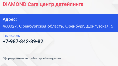 DIAMOND Cars, центр детейлинга по адресу 460027, Оренбургская область, Оренбург, Донгузская, 5 в дальнейшем Организация, размещена в следующих категориях:
