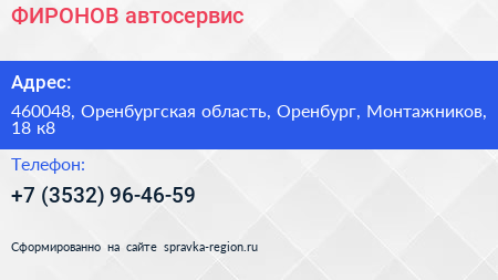 ФИРОНОВ, автосервис по адресу 460048, Оренбургская область, Оренбург, Монтажников, 18 к8 в дальнейшем Организация, размещена в следующих категориях:
