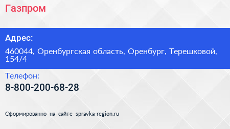 Газпром по адресу 460044, Оренбургская область, Оренбург, Терешковой, 154/4 в дальнейшем Организация, размещена в следующих категориях:
