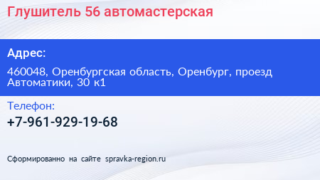 Глушитель 56, автомастерская по адресу 460048, Оренбургская область, Оренбург, проезд Автоматики, 30 к1 в дальнейшем Организация, размещена в следующих категориях: