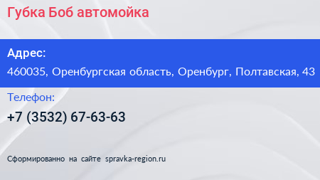 Губка Боб, автомойка по адресу 460035, Оренбургская область, Оренбург, Полтавская, 43 в дальнейшем Организация, размещена в следующих категориях: