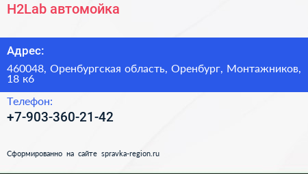 H2Lab, автомойка по адресу 460048, Оренбургская область, Оренбург, Монтажников, 18 к6 в дальнейшем Организация, размещена в следующих категориях: