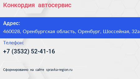 Конкордия+, автосервис по адресу 460028, Оренбургская область, Оренбург, Шоссейная, 32а в дальнейшем Организация, размещена в следующих категориях: