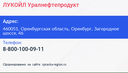 ЛУКОЙЛ-Уралнефтепродукт по адресу 460051, Оренбургская область, Оренбург, Загородное шоссе, 46 в дальнейшем Организация, размещена в следующих категориях:
