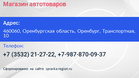 Магазин автотоваров по адресу 460060, Оренбургская область, Оренбург, Транспортная, 10 в дальнейшем Организация, размещена в следующих категориях: