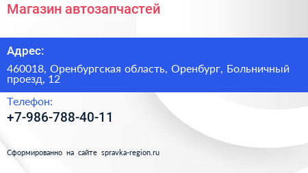 Магазин автозапчастей по адресу 460018, Оренбургская область, Оренбург, Больничный проезд, 12 в дальнейшем Организация, размещена в следующих категориях: