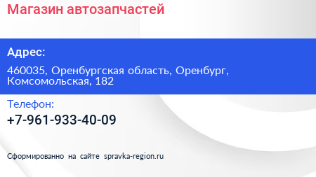 Магазин автозапчастей по адресу 460035, Оренбургская область, Оренбург, Комсомольская, 182 в дальнейшем Организация, размещена в следующих категориях: