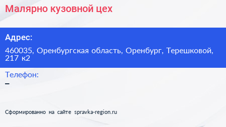 Малярно-кузовной цех по адресу 460035, Оренбургская область, Оренбург, Терешковой, 217 к2 в дальнейшем Организация, размещена в следующих категориях: