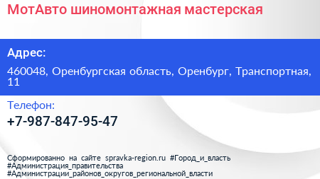 МотАвто, шиномонтажная мастерская по адресу 460048, Оренбургская область, Оренбург, Транспортная, 11 в дальнейшем Организация, размещена в следующих категориях: