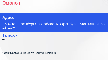 Омолон по адресу 460048, Оренбургская область, Оренбург, Монтажников, 29 дом в дальнейшем Организация, размещена в следующих категориях: