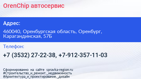 OrenChip, автосервис по адресу 460040, Оренбургская область, Оренбург, Карагандинская, 57Б в дальнейшем Организация, размещена в следующих категориях: