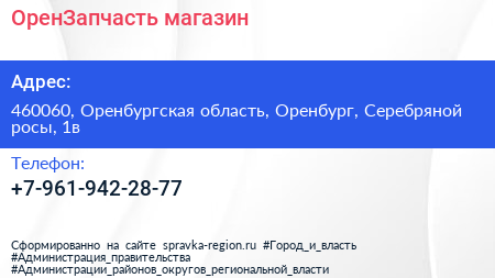 ОренЗапчасть, магазин по адресу 460060, Оренбургская область, Оренбург, Серебряной росы, 1в в дальнейшем Организация, размещена в следующих категориях: