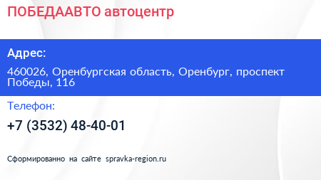 ПОБЕДААВТО, автоцентр по адресу 460026, Оренбургская область, Оренбург, проспект Победы, 116 в дальнейшем Организация, размещена в следующих категориях: