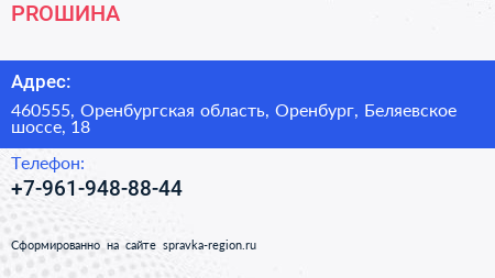 PROШИНА по адресу 460555, Оренбургская область, Оренбург, Беляевское шоссе, 18 в дальнейшем Организация, размещена в следующих категориях: