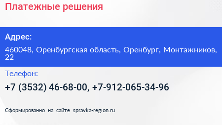 Платежные решения по адресу 460048, Оренбургская область, Оренбург, Монтажников, 22 в дальнейшем Организация, размещена в следующих категориях: