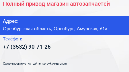 Полный привод, магазин автозапчастей по адресу Оренбургская область, Оренбург, Амурская, 61а в дальнейшем Организация, размещена в следующих категориях: