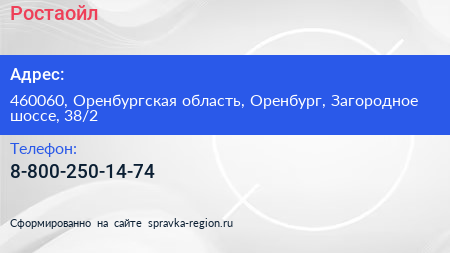 Ростаойл по адресу 460060, Оренбургская область, Оренбург, Загородное шоссе, 38/2 в дальнейшем Организация, размещена в следующих категориях: