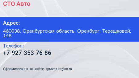 СТО-Авто по адресу 460038, Оренбургская область, Оренбург, Терешковой, 148 в дальнейшем Организация, размещена в следующих категориях:
